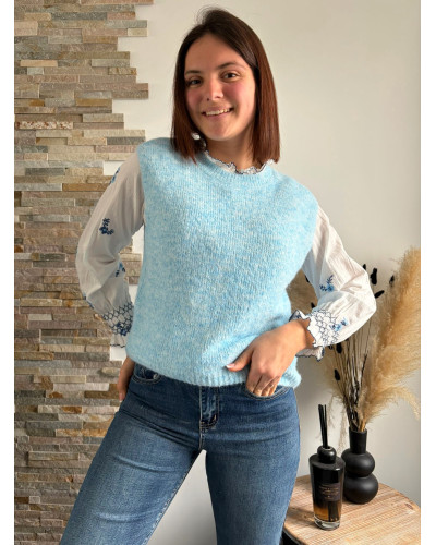 Nouveau Supprimer du panier Liste de souhaits APERCU Panier EMILIO | Pull manches... Coup de coeur Prix 30,90 € SM ML L'audace du bleu ciel et le charme de l'effet volant Apportez une touche de caractère à votre dressing avec le pull sans manches Emilio ....