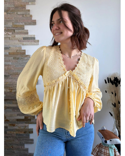 Nouveau Supprimer du panier Liste de souhaits APERCU Panier VALENTINA | Blouse jaune... Tops & Blouses Prix 32,90 € SM ML La blouse Valentina : la fraîcheur du jaune alliée au charme romantique d'une coupe péplum délicatement brodée Succombez au style bohème chic...