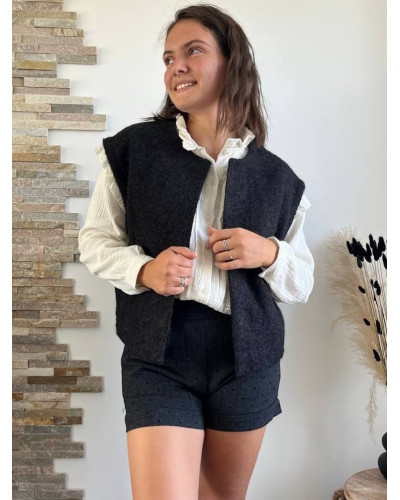 Supprimer du panier Liste de souhaits APERCU Panier Veste Cherry Coup de coeur Prix 32,90 € SM ML Veste sans manches « poilue écrue » douceur et caractère réunis. Sa matière moelleuse enveloppe d’un noir chaleureux, la coupe droite sans manches...