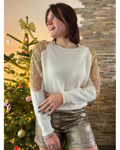 Nouveau Supprimer du panier Liste de souhaits APERCU Panier Pull Pharell Collection fête Prix 39,90 € Taille Unique Le pull Pharell incarne cette élégance simple qu’on aime tant : une maille fine écrue pleine de caractère, sublimée par de délicates manches...