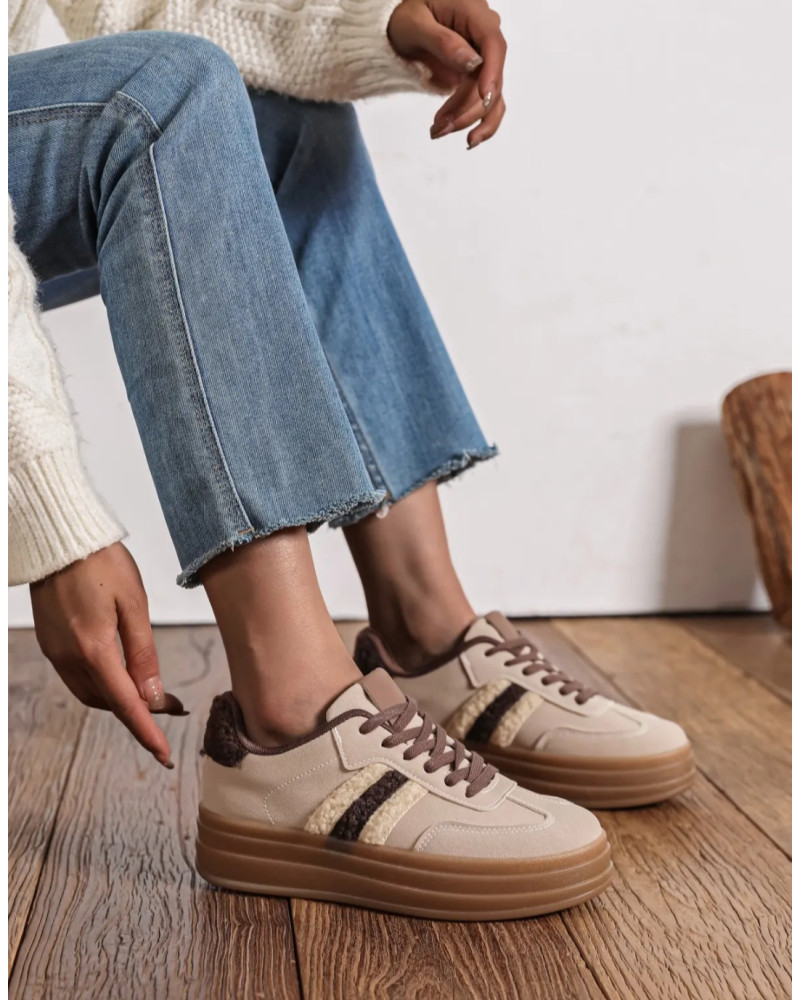 Quand votre chaussure devient le détail qui change tout : ces baskets beige à plateforme incarnent le parfait équilibre entre audace et sobriété. À la fois rehaussées par leur semelle épaissie et tempérées par leur teinte sombre, elles séduisent par leur capacité à magnifier un look sans en faire trop. Que vous arpentiez les rues de la ville ou que vous souhaitiez relever une tenue minimaliste, elles sont le choix idéal : robustes, stylées, faciles à assortir.