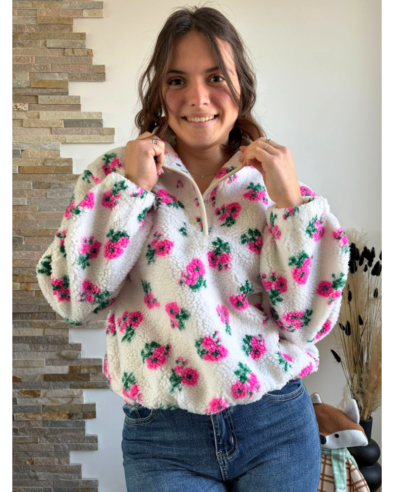 Succombez au confort absolu avec la polaire Alex fleurie rose, une pièce ultra douce et chaleureuse idéale pour les journées fraîches. Confectionnée dans une matière effet moumoute, elle séduit par sa texture enveloppante et son motif rose qui ajoute de la vitalité à votre look.