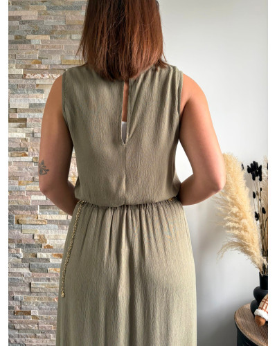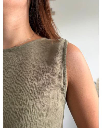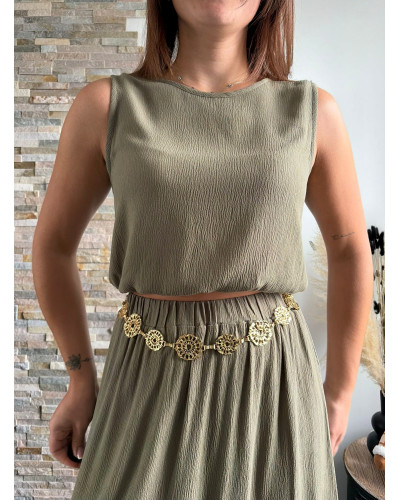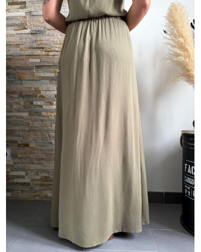 Cet ensemble femme kaki composée d'un top sans manches et d'une jupe longue fluide incarne l'élégance simple et moderne. Sa coupe épurée et sa teinte naturelle en font une pièce facile à porter au quotidien.