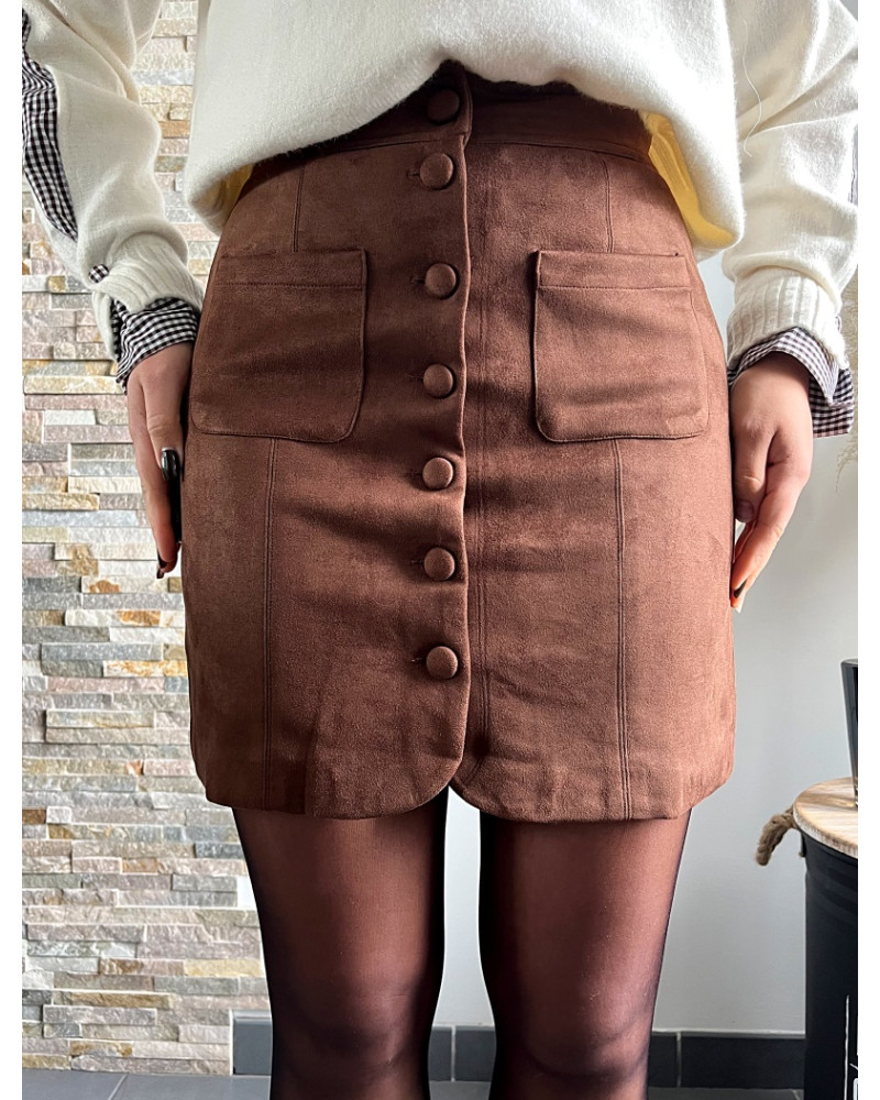 Sa matière effet suédine est douce et agréable au toucher, vous offre un confort irrésistible tandis que ses boutons apparents et ses poches pratiques apportent une touche vintage ultra-tendance. Le coloris marron chaud s’accorde facilement avec des tons neutres, des écrus ou même des touches plus vives, pour des looks variés et modernes.
