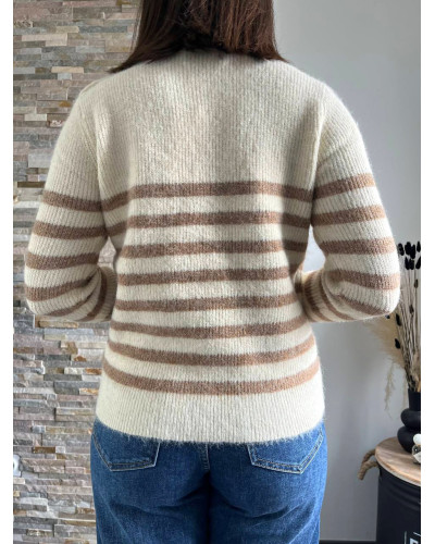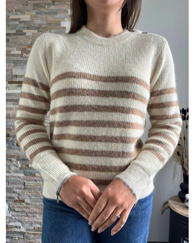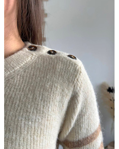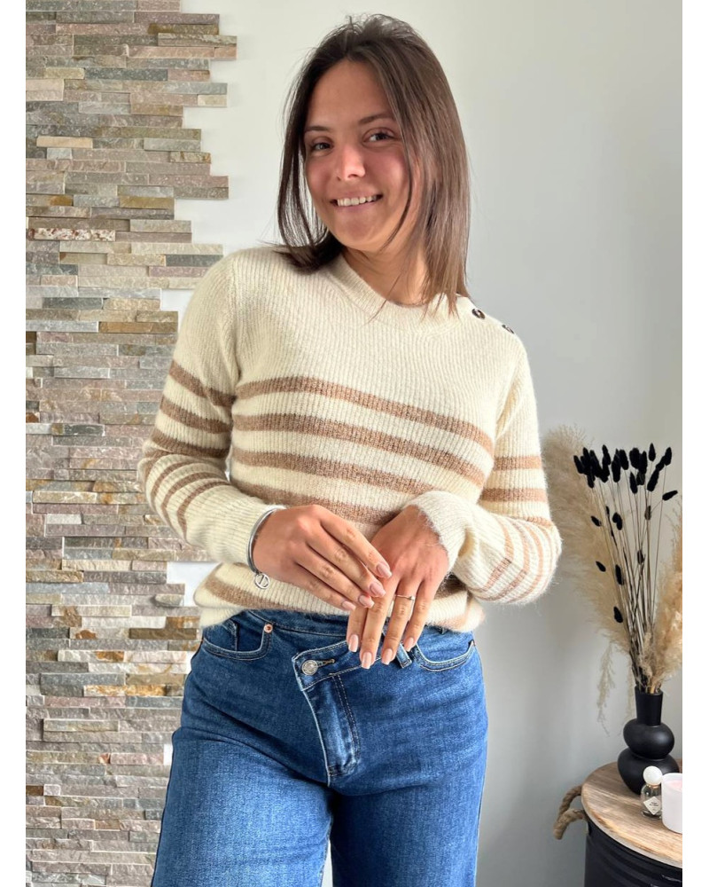 Confectionné dans une maille douce aux tons écru et beige, ce pull rayé arbore une touche raffinée et originale avec ses trois boutons placés sur l’épaule. La coupe droite offre un confort relax et une silhouette équilibrée, tandis que le jeu de rayures apporte une élégance discrète. Parfait pour glisser sur un jean clair ou sous une veste, ce modèle mêle subtilement confort cosy et détails soignés pour illuminer les journées fraîches.
