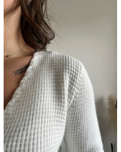 Succombez au charme intemporel de notre gilet blanc en maille ruchée, l'allié parfait des looks élégants et des journées fraiches. Sa coupe droite est idéale pour toutes les morphologies. Son col en V délicatement tressé apporte une touche féminine et raffinée.