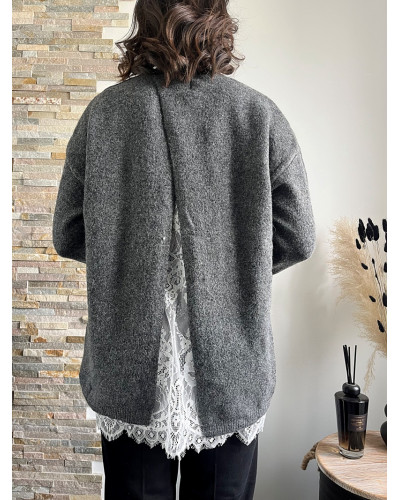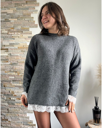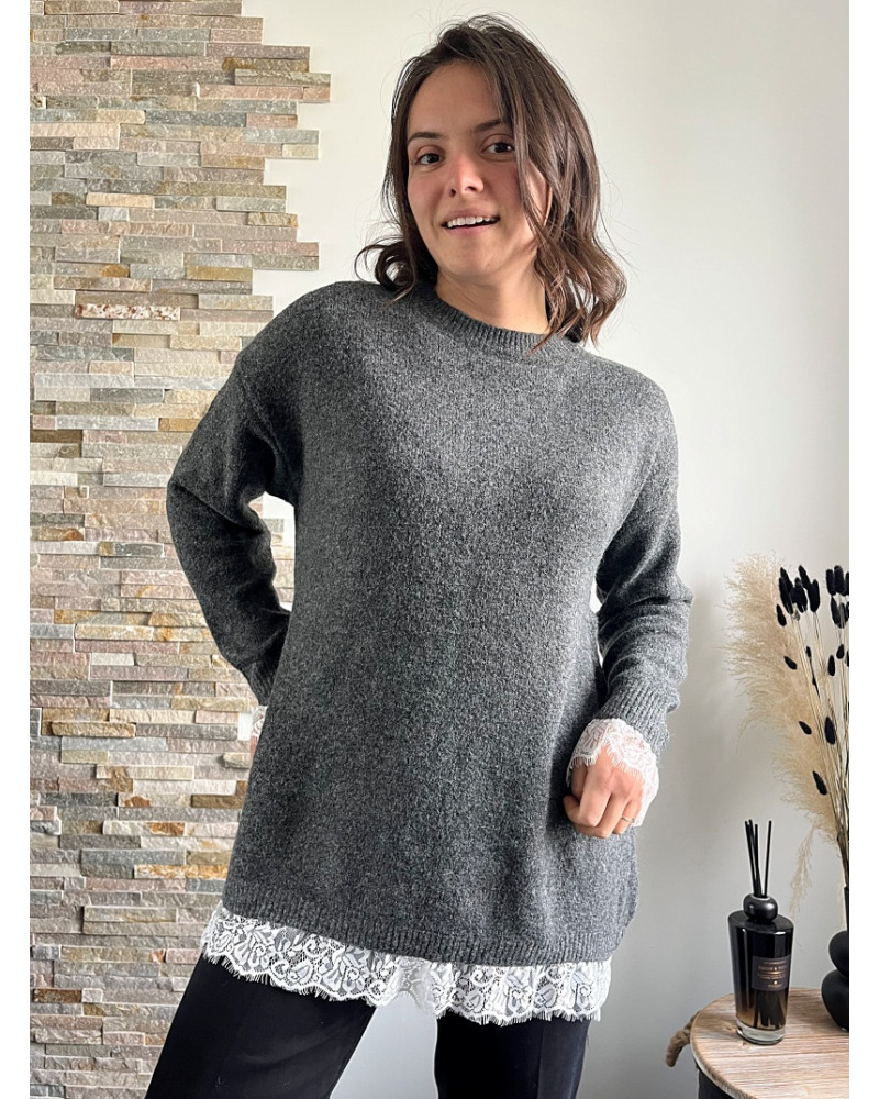 Vous allez adorer le pull Bobby gris en maille douce au bord dentelle. Il est parfait pour l’automne et l’hiver, apportant à la fois chaleur et style à vos tenues.