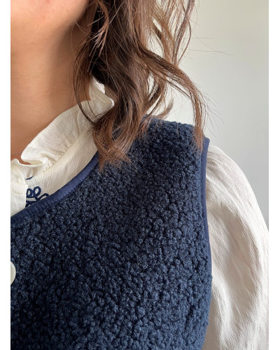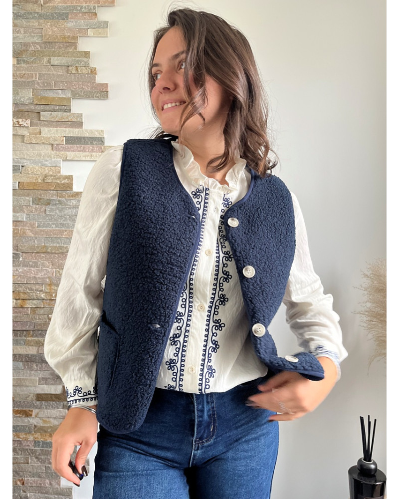 Un incontournable douillet et pratique : un gilet sans manches en sherpa bleu marine, conçu pour vous garder au chaud avec élégance, beaucoup de style, beaucoup de confort.