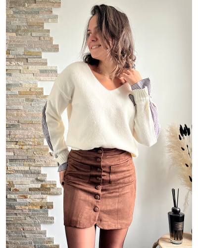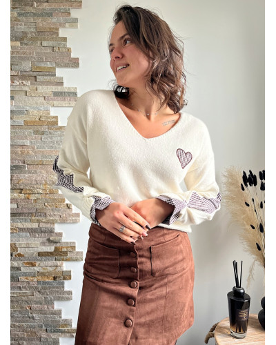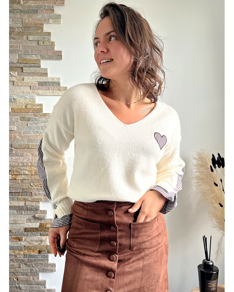 Succombez au charme intemporel de notre pull en maille blanc revisité avec une touche d’originalité ! Ce modèle associe la douceur d’une maille confortable à des manches en tissu vichy noir et blanc, pour un style à la fois féminin, moderne et chic.