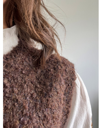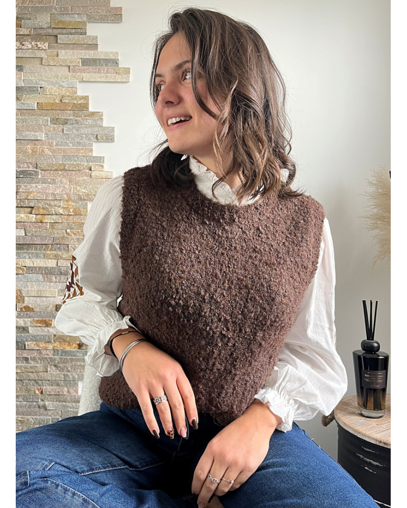 Sa maille bouclette ultra-douce offre un effet cocooning irrésistible, tandis que sa coupe sans manches en fait un allié idéal pour le superposition look de saison. Le coloris marron chaud s’accorde facilement avec des tons neutres, des écrus ou même des touches plus vives, pour des looks variés et modernes. La fermeture sur le côté permet un enfilage simple et pratique.