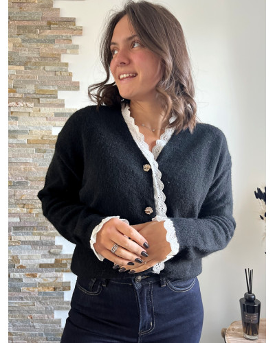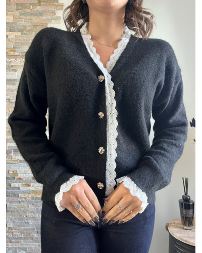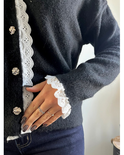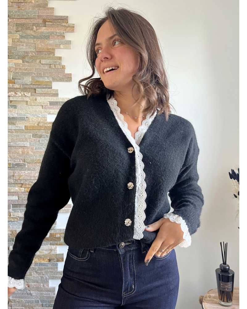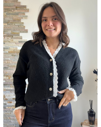 Ce gilet noir avec ses détails brodés se distingue par ses finitions délicatement travaillés apportant une touche de romantisme et d'élégance. Avec sa coupe droite il s'adapte à toutes les morphologies