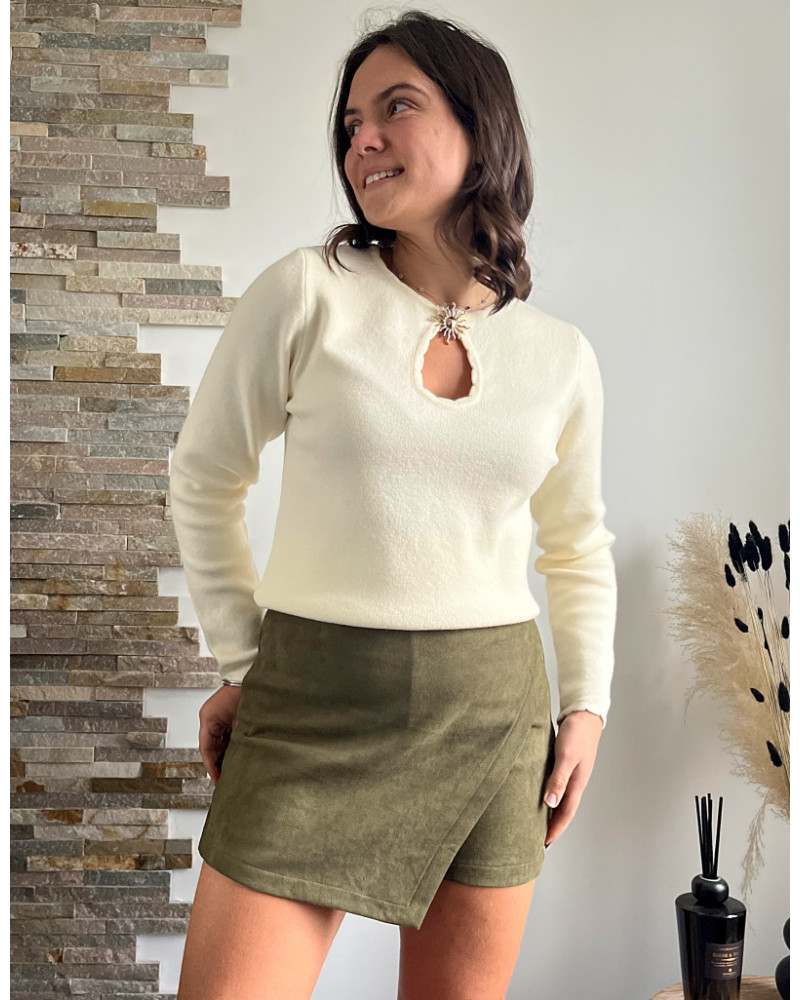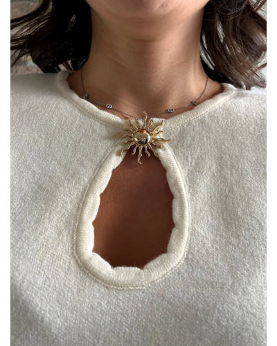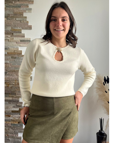 Sublimez votre look avec ce pull écru raffiné, conçu pour allier élégance et confort au quotidien. Sa coupe droite met en valeur toutes les silhouettes, tandis que sa broche soleil doré au décolleté apporte une touche féminine et lumineuse. Confectionné dans une maille douce et agréable à porter, ce pull s’associe facilement à une jupe, un jean ou un pantalon habillé pour un style intemporel et chic.