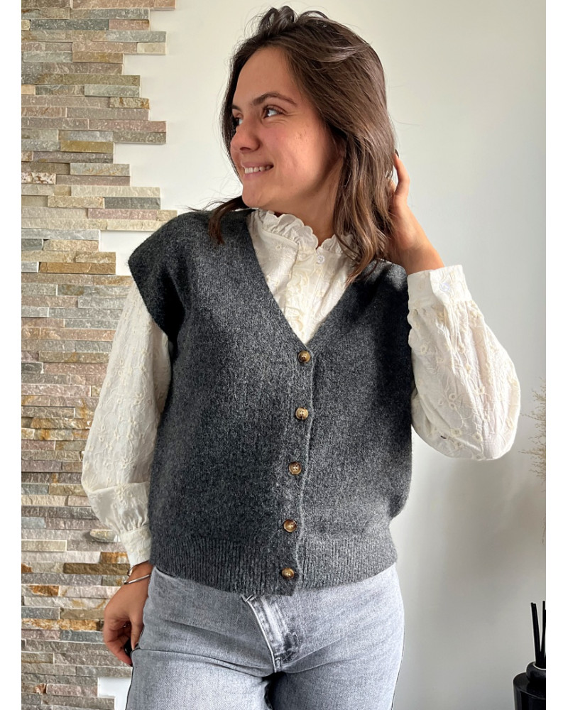 Grace à sa coupe féminine et légérement ample, il se porte facilement sur une blouse, chemise ou même sur une robe, pour un effet tendance sans effort. Sa couleur gris foncé s'adapte facilement à toutes les teintes, faisant de ce gilet un indispensable du dressing.