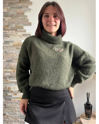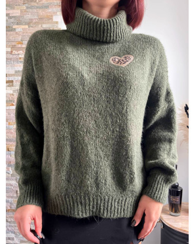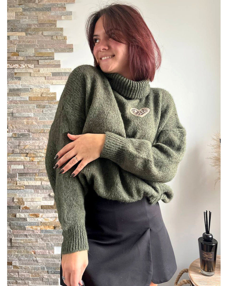 Confort et douceur s’invitent dans votre dressing avec ce pull en maille kaki col roulé. Confectionné dans une maille douce et souple, c'est l'allié parfait pour mixer chaleur et élégance et sublimer vos tenues du quotidien. Petit détails sur la poitrine avec un cœur léopard qui apporte une touche raffinée et romantique, idéale pour un look tendance et chic.