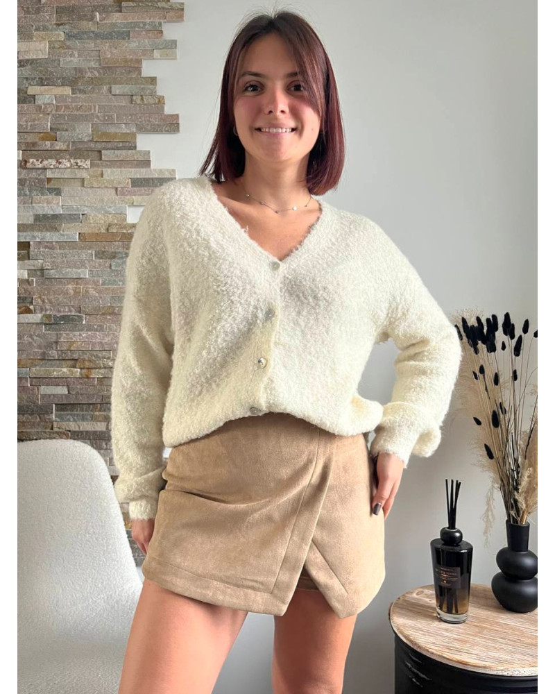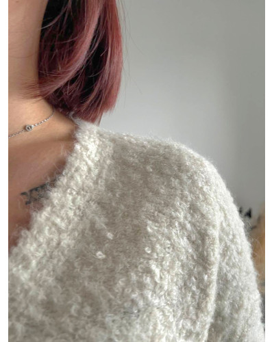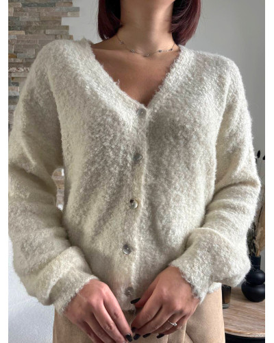 Le petit twist ? Le boutonnage nacré , qui insuffle une touche romantique et délicate à ce gilet intemporel.