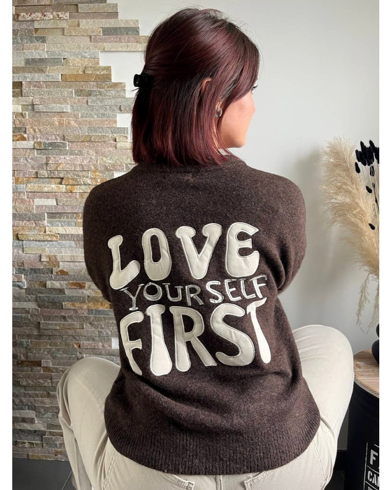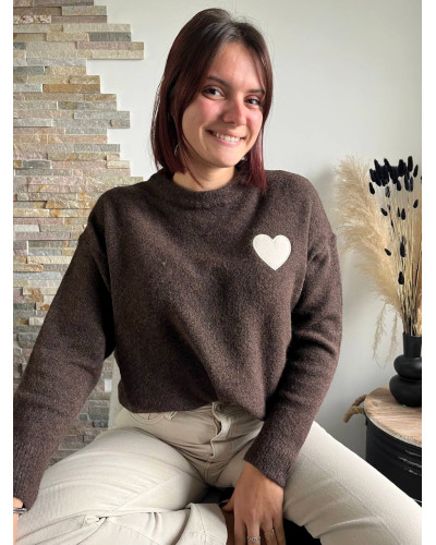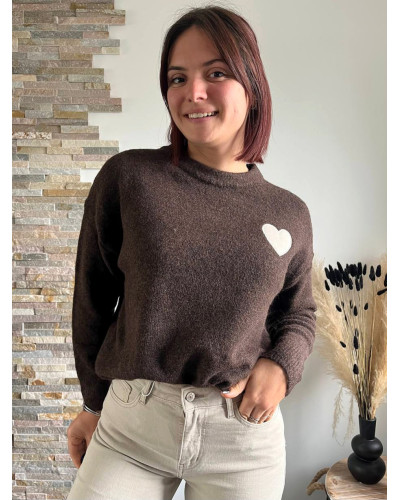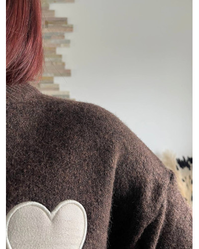 Son coloris marron chocolat et sa maille agréable offrent confort et chaleur, tandis que l'inscription beige au dos apporte une touche romantique et moderne qui ne passe pas inaperçue.