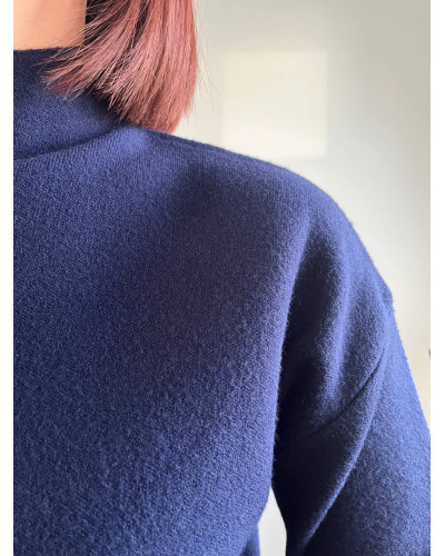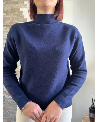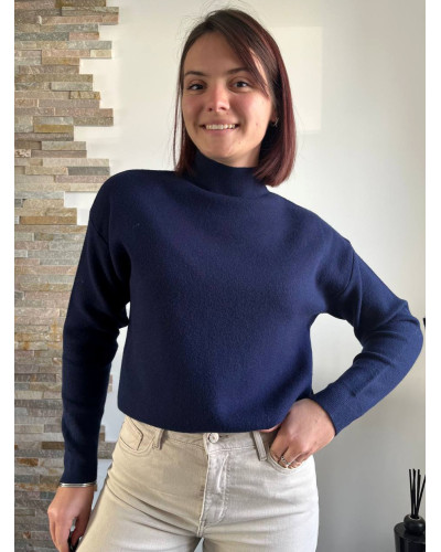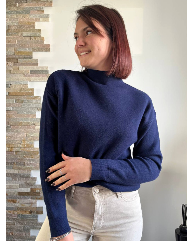 Féminité et douceur s’invitent dans votre dressing avec ce pull en maille bleu marine à col montant. Confectionné dans une maille douce et souple, c'est l'allié parfait pour mixer chaleur et élégance et sublimer vos tenues du quotidien. Son col montant délicatement travaillé apporte une touche raffinée et romantique, idéale pour un look tendance et chic.