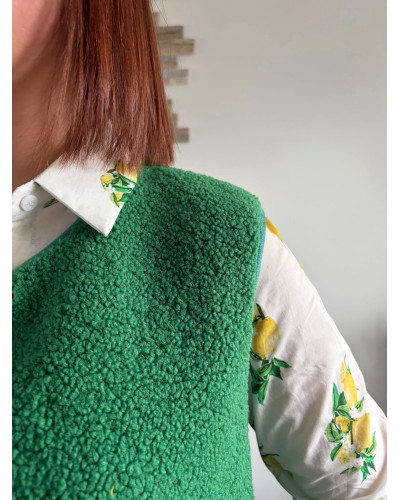 Adoptez le look cocooning avec le gilet sans manche Guillaume. Confectionné dans une matière sherpa vert ultra-moelleuse, ce gilet est la pièce idéale pour rester au chaud tout en restant tendance. Son aspect "moutonné" apporte une touche de texture et de modernité à toutes vos tenues de saison.