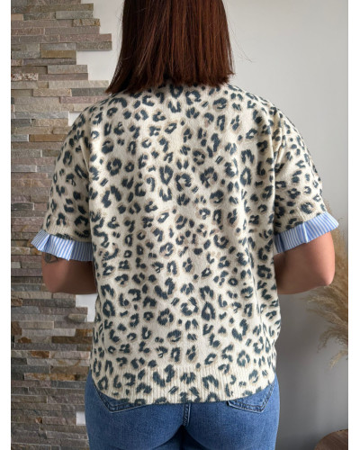 Détails : Motif léopard, col et manche rayé bleu et blanc, coupe droite légèrement oversize.