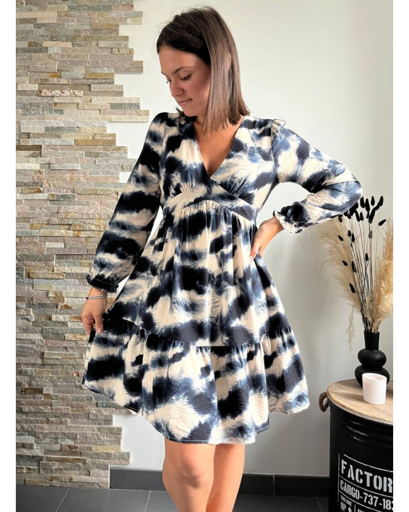 Robe courte écrue & bleu marine : coupe légèrement trapèze, encolure en V. Imprimé bleu marine sur fond écru. Tissu léger, fluide, confortable. Idéale accompagnée de sandales ou bottines, accessoires dorés ou camel.