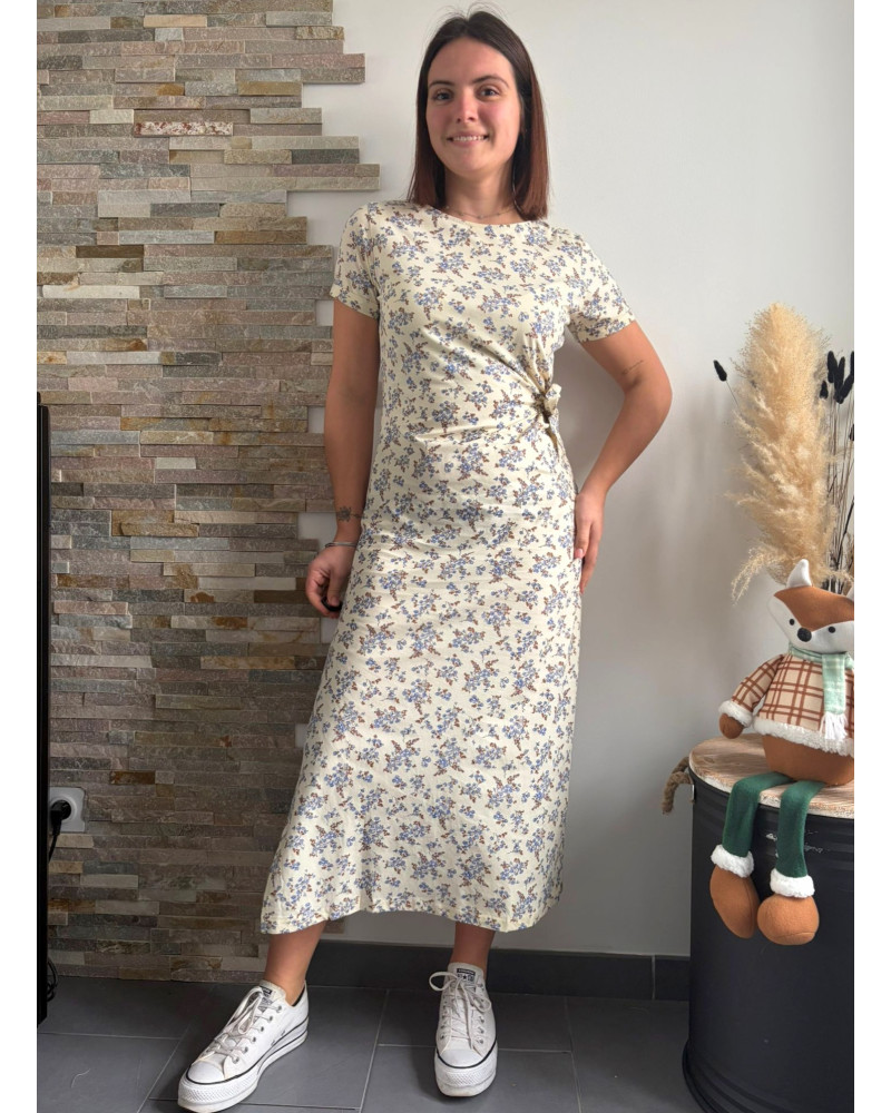 • Détails : Imprimé fleuri bleu, manches courtes, fente discrète