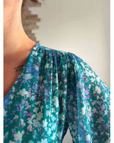 MYRTILLE | Robe longue fleurie verte effet drapé sous la poitrine
