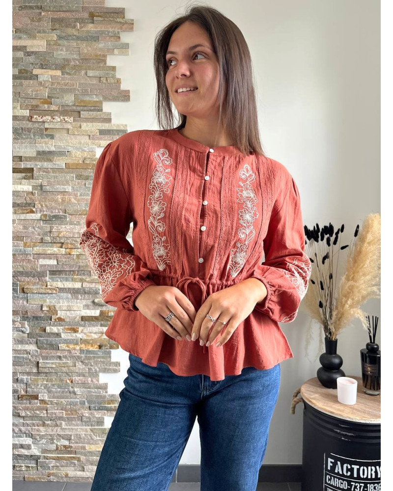 Craquez pour notre blouse Celeste avec sa coupe peplum, teinte brique chaude rappelant la terre cuite. Broderies écrues contrastantes sur les manches et sur la poitrine, apportant une touche artisanale délicate. Boutonnage sur le devant, manches longues. Matière douce, en coton, confortable au porté. Parfaite rentrée dans un jean clair ou sur une jupe neutre pour faire ressortir la couleur.