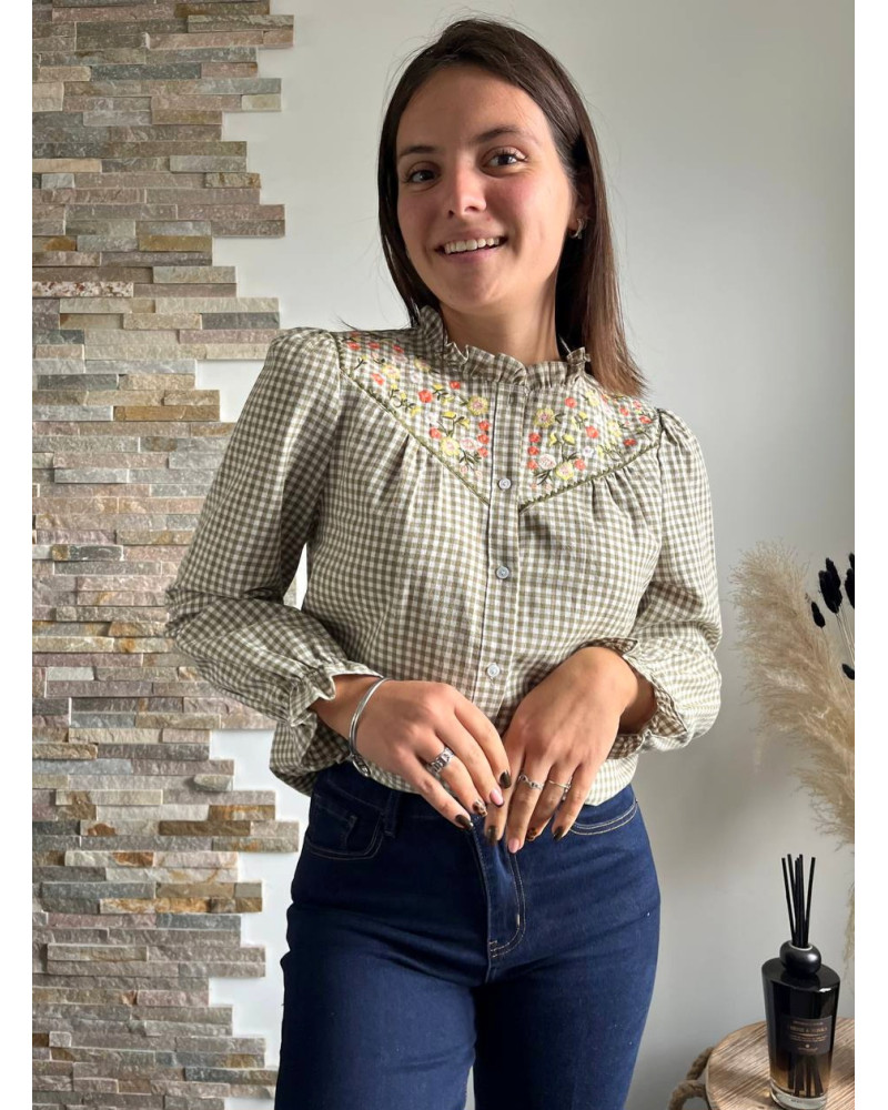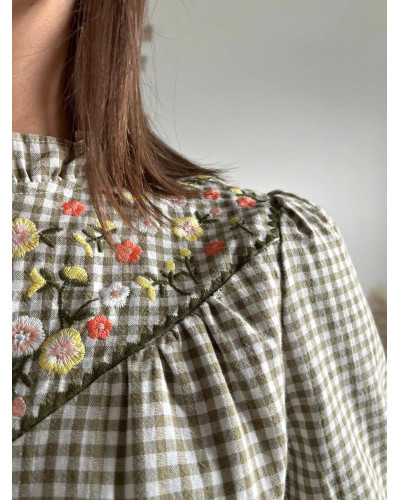 Son tissu léger au motif vichy revisité en version kaki apporte une touche d’authenticité, tandis que les broderies minutieuses aux teintes vives (roses, jaunes, corail…) ajoutent du relief et de la gaieté au niveau des épaules. Sa coupe fluide, légèrement ample, garantit confort et liberté de mouvement.