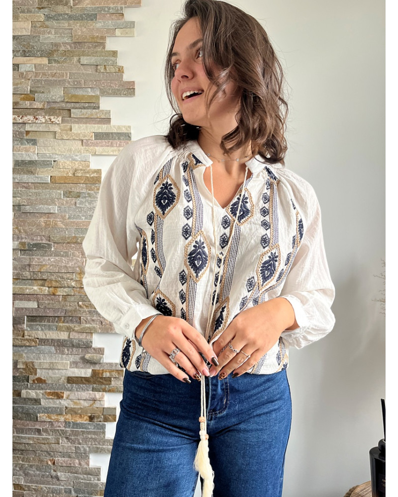 Vous allez adorer la blouse Stella blanche avec ses broderie beige et bleu marine. Elle est parfaite pour l’automne et l’hiver, apportant à la fois chaleur et style à vos tenues.