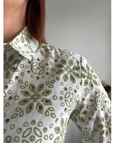 La chemise Fleurette séduit par son imprimé végétal délicat, qui mêle modernité et douceur. Son motif vert lumineux apporte une touche fraîche et élégante à la silhouette.
