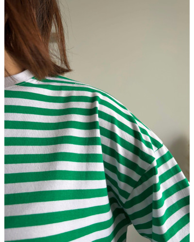 Type : Tee shirt rayé blanc et vert coupe droite légèrement oversize.