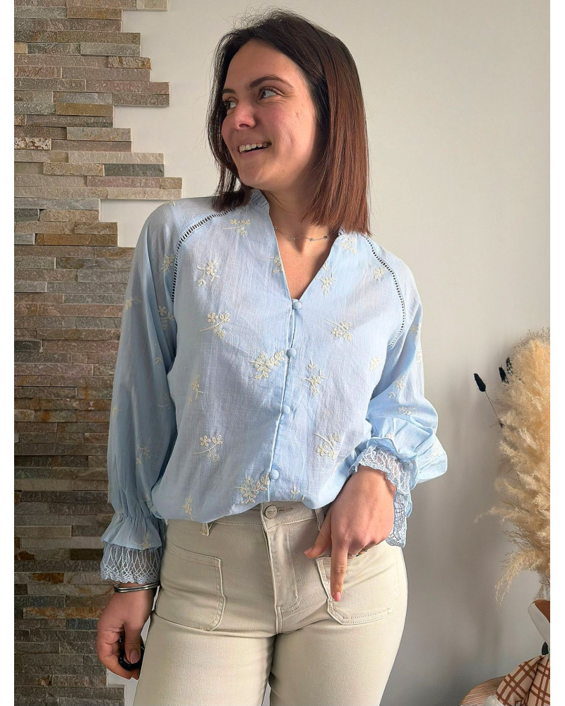 - Type: Blouse bleu clair brodée