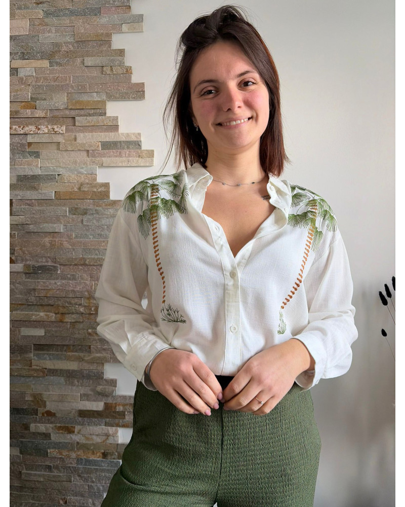 CLAUDINE | Chemise blanche broderie kaki tropicale