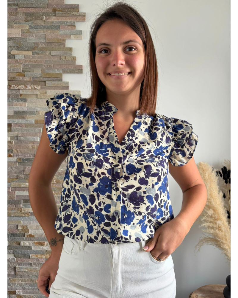La blouse Minnie mêle féminité et caractère dans un motif bleu lumineux sur un fond écru qui capte le regard sans efforts.