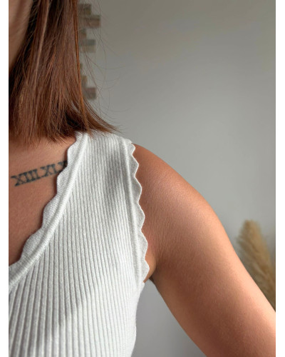 Ce top femme en maille fine blanc est indispensable pour une silhouette élégante et naturelle. Son décolleté festonné souligne subtilement le buste et apporte une finition romantique à ce basique intemporel