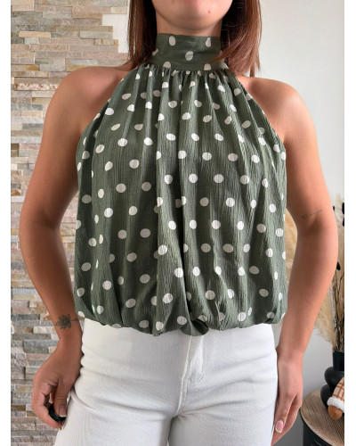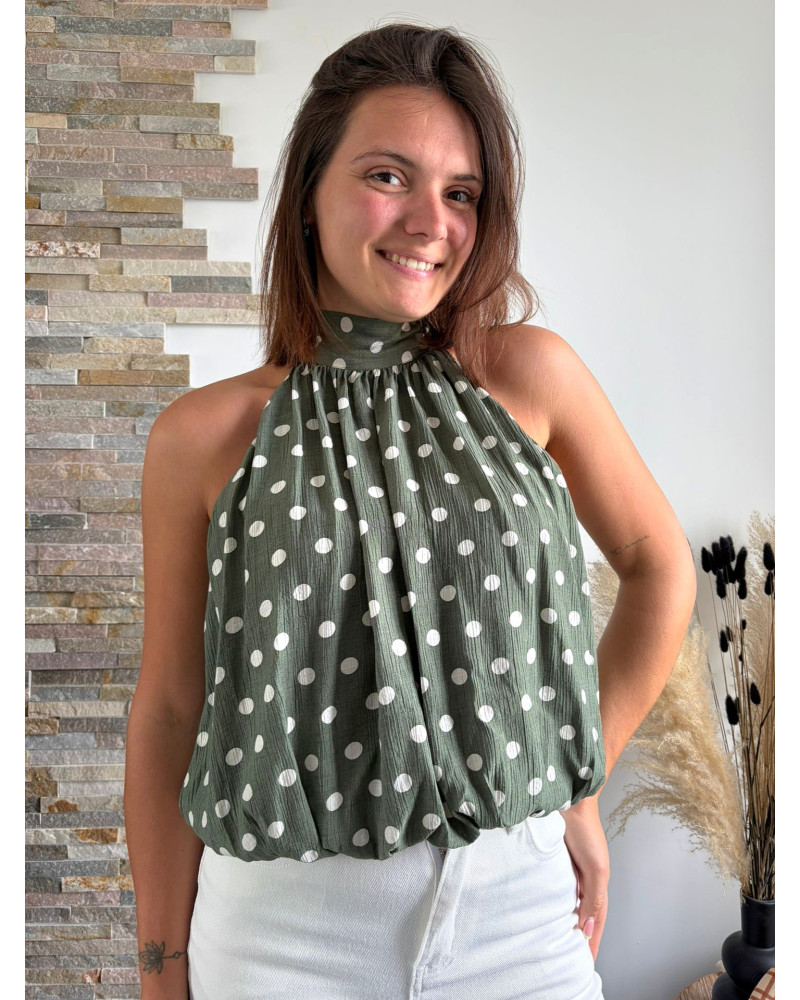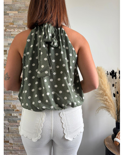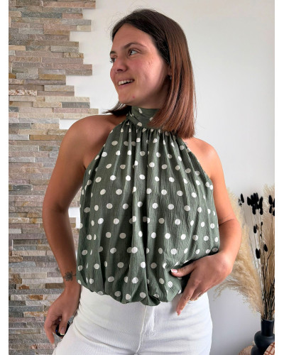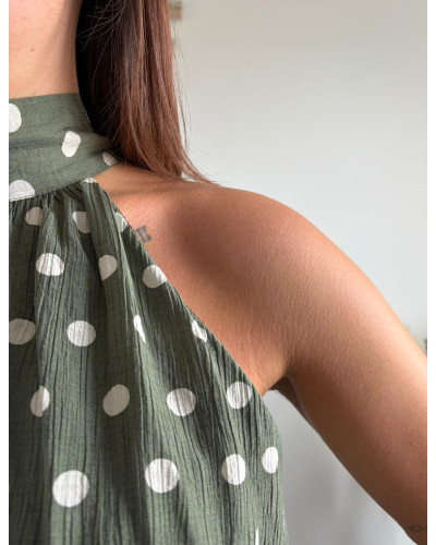Ce top vert olive à pois blancs séduit par son col halter et sa coupe fluide ultra flatteuse. Une pièce élégante et facile à porter pour l'été.