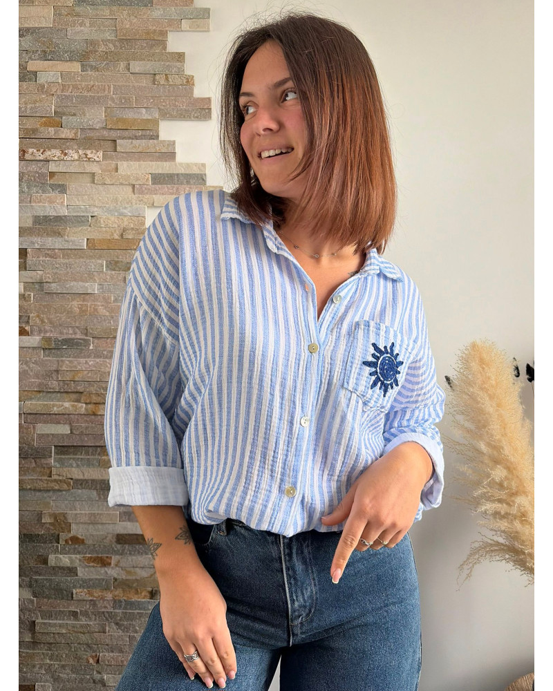 Succombez au style bohème chic avec la Chemise Opaline en gaze de coton rayé. Confectionnée en 100% coton, cette pièce légère et respirante se distingue par ses rayures bleues et sa broderie soleil délicate sur la poitrine pour un look féminin plein de fraîcheur.